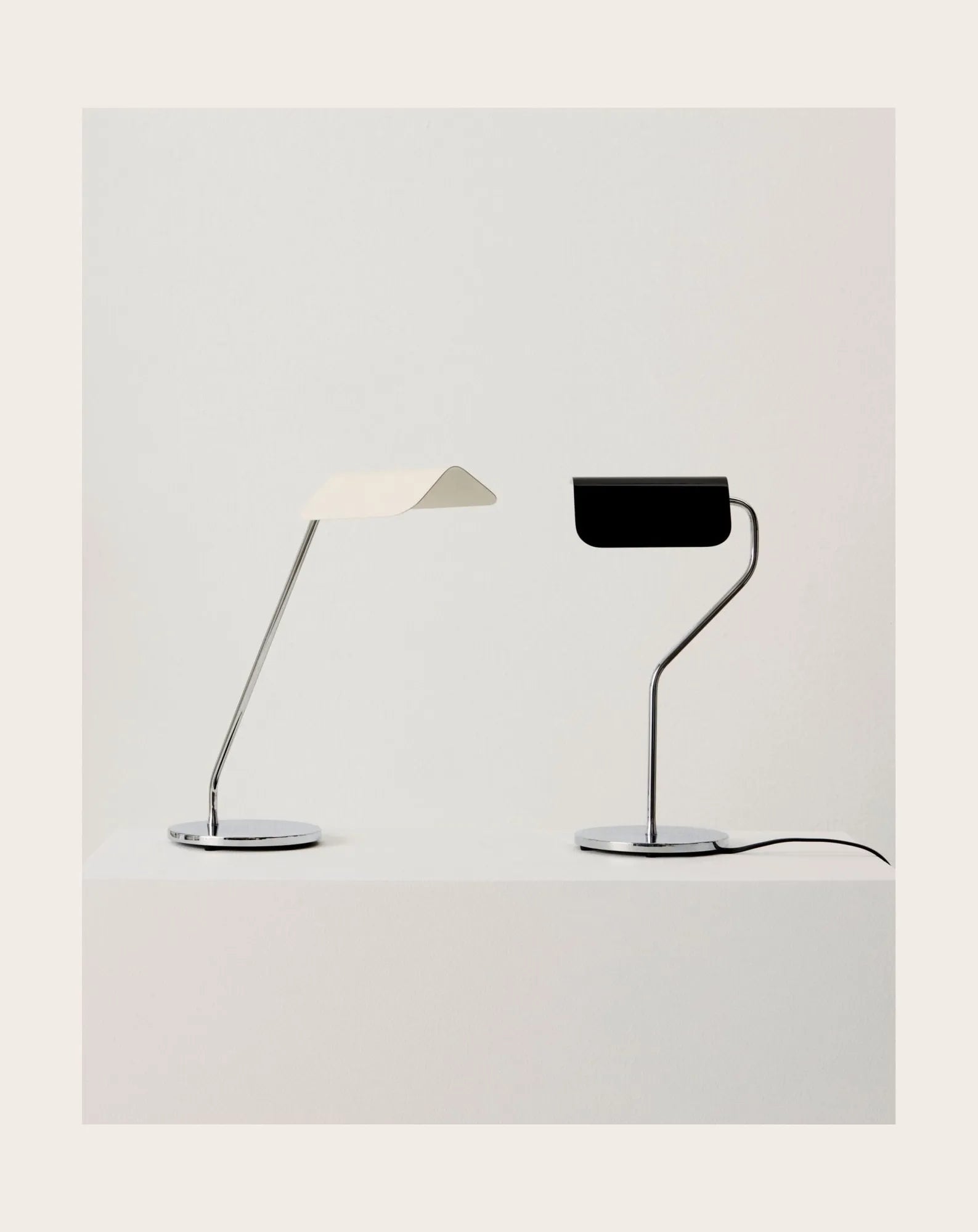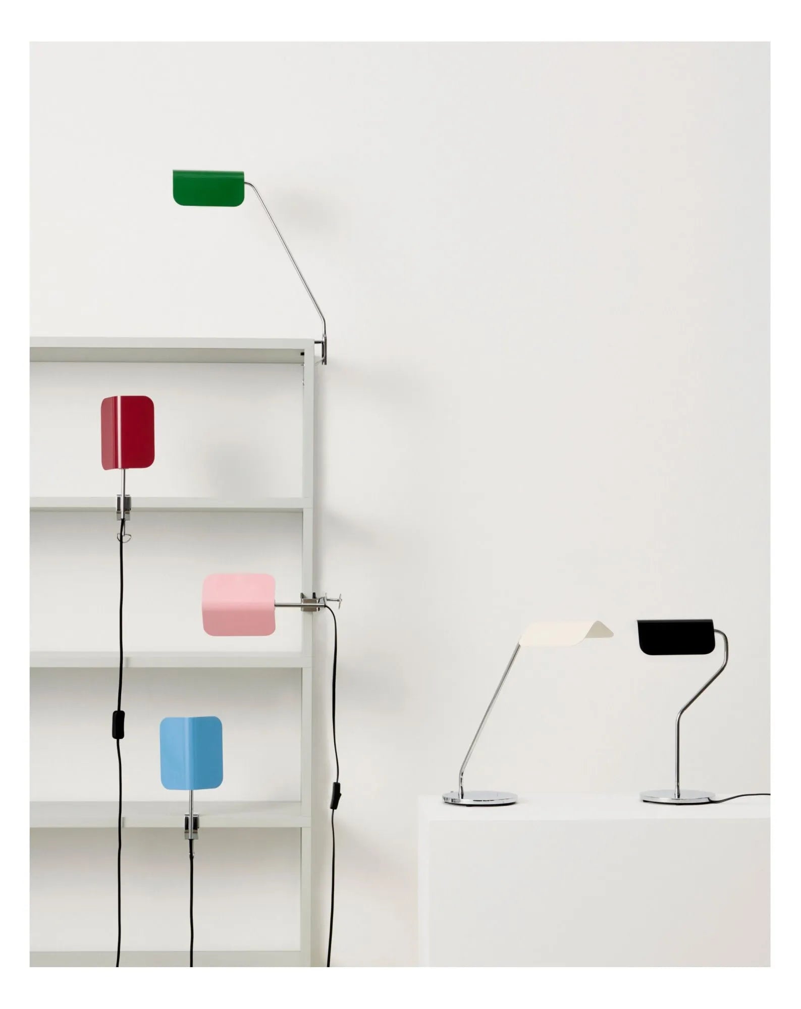 This series of lamps is inspired by the famous Banker's Light. Here, the designer gives them a contemporary twist with pointed-roof shades and a minimalist chrome base.