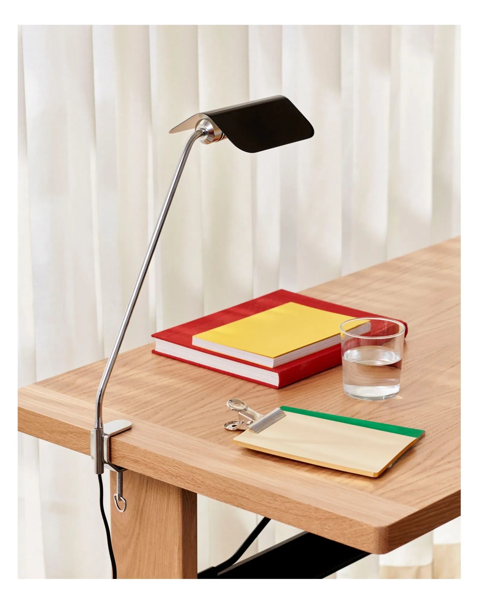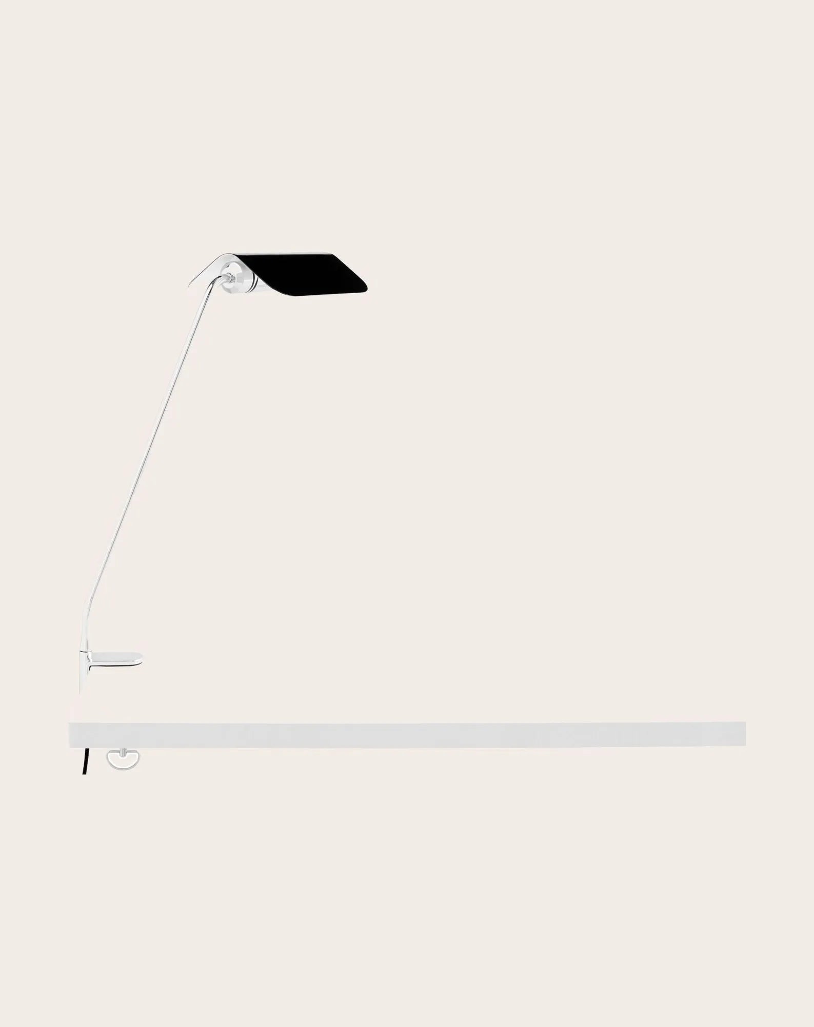 This series of lamps is inspired by the famous Banker's Light. The designer has given them a contemporary twist, with pointed roof-shaped shades and a minimalist chrome base. The adjustable clip allows the lamp to be mounted on a wide variety of vertical and horizontal surfaces, and the shade, which can rotate 360°, allows you to direct the light to suit your needs.