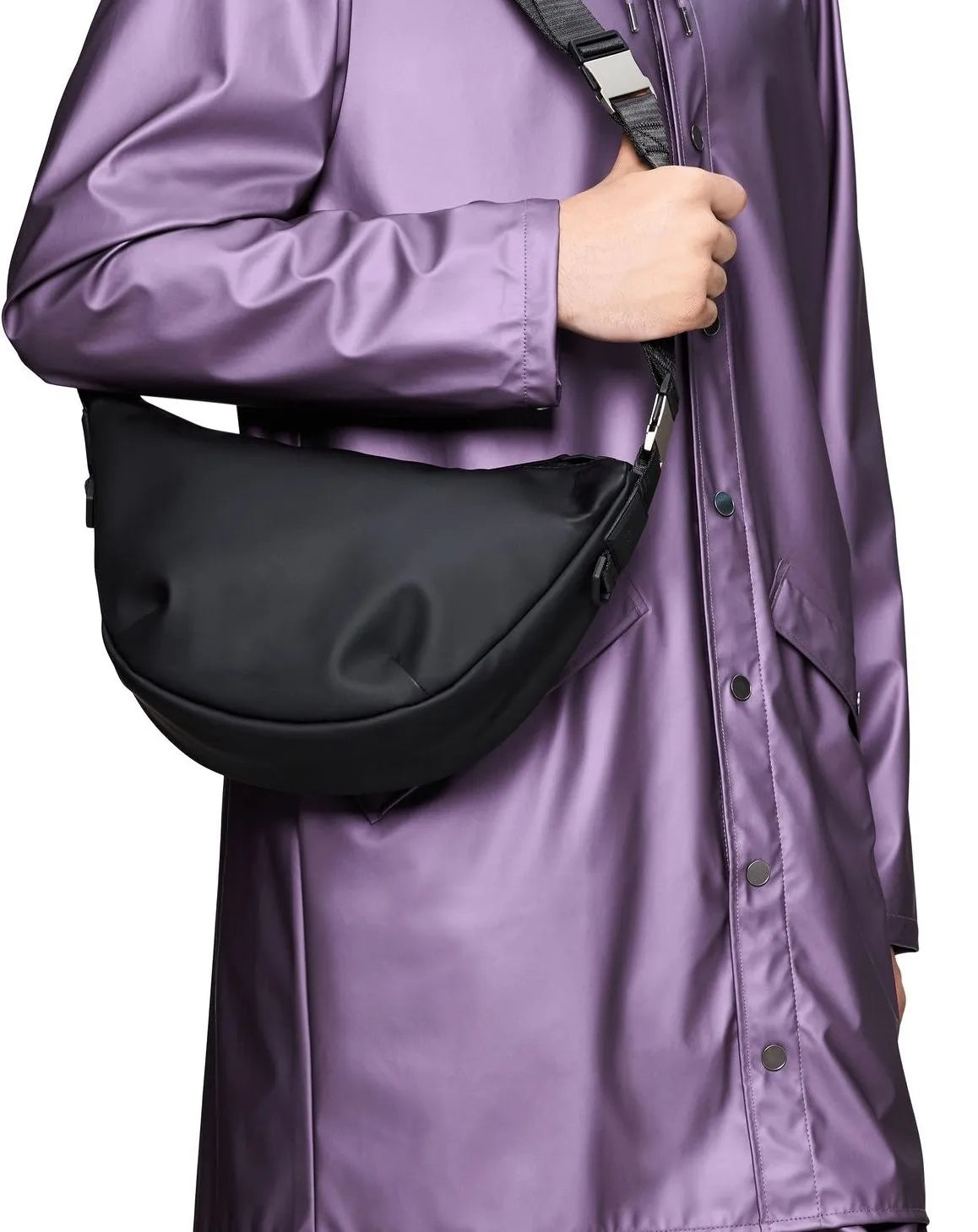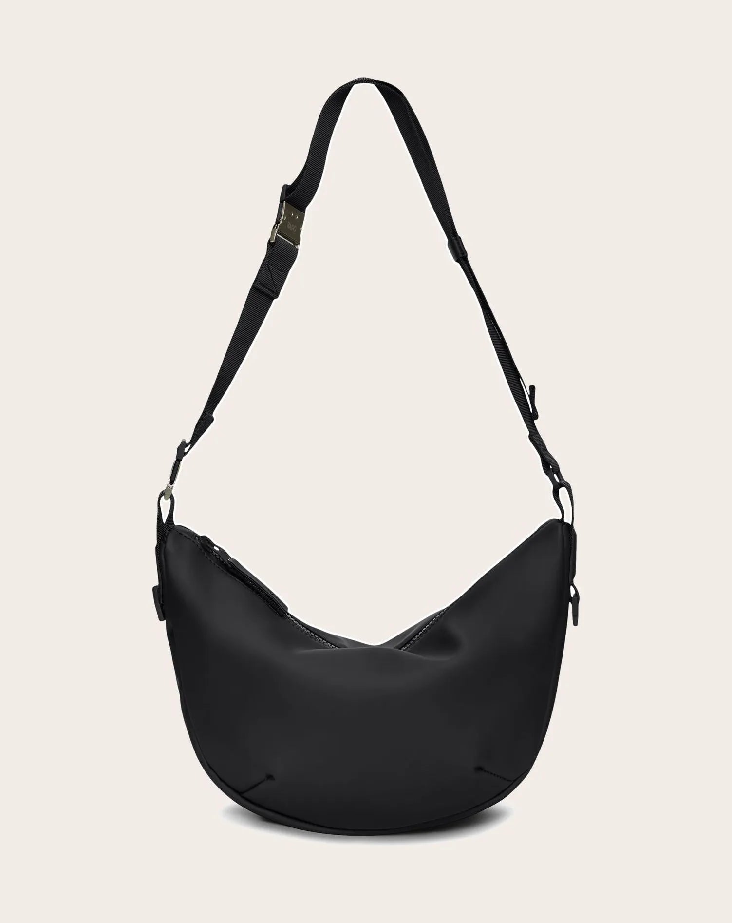 The Valera Shoulder Bag features a soft, easy-to-wear shape that drapes beautifully when worn over the shoulder or slung over the shoulder. The Valera Shoulder Bag features a soft, easy-to-wear shape that drapes beautifully when worn over the shoulder or slung over the shoulder. Open the coated zipper to enter a main compartment with an inside pocket to keep your small essentials in place. Wear this Valera model on the shoulder, across the body or as a handbag, the design features an adjustable webbing shoulder strap with a contrasting color insert. Simply clip on the removable part for a touch of contrast - or remove it for a sleeker look. Brushed silver hardware, combined with branded silicone details, give an enhanced touch to the soft look and feel. The Valera shoulder bag is crafted in Rains' signature PU fabric with a coating on a softer back side. Material: 100.00% PES (Polyester) Lining: 100.00% PU (Polyurethane) Water column pressure: 8000 mm Water resistance rating: W3 - Waterproof protection against moderate daily rainfall.