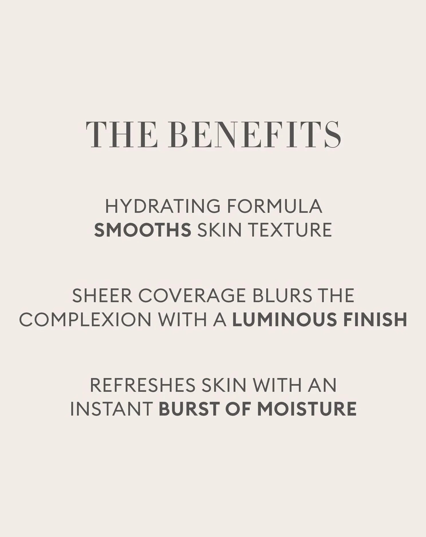 A hydrating serum with microencapsulated pigments that burst on contact to deliver light coverage, blurring the complexion for a luminous finish while helping to refresh and instantly hydrate skin. Available in 14 versitale tints. Ideal for all skin type especially dry and dehydrated skin.