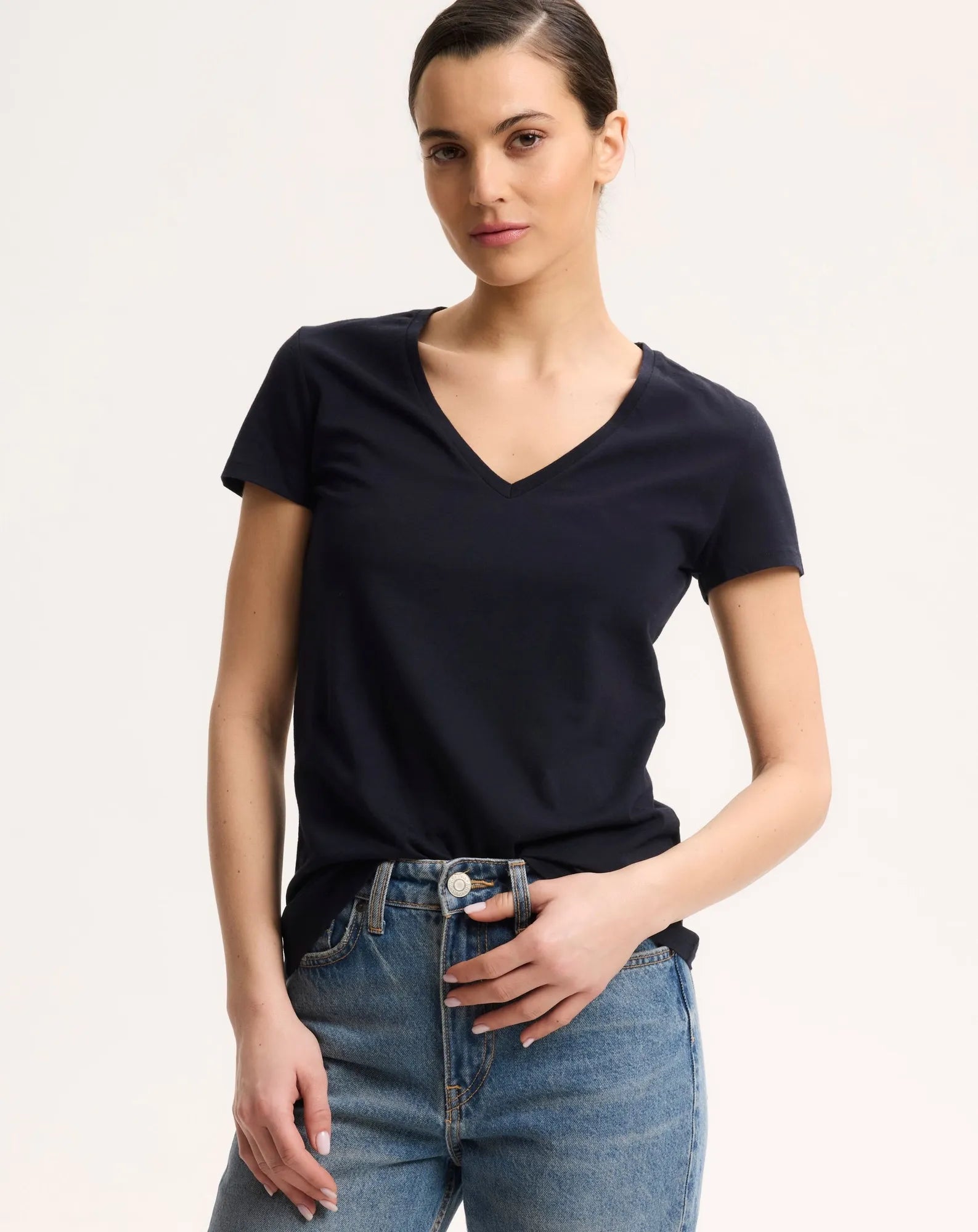 Julia short-sleeved V-neck T-shirt in organic cotton is made from a natural, soft and comfortable fabric, ideal for everyday use.