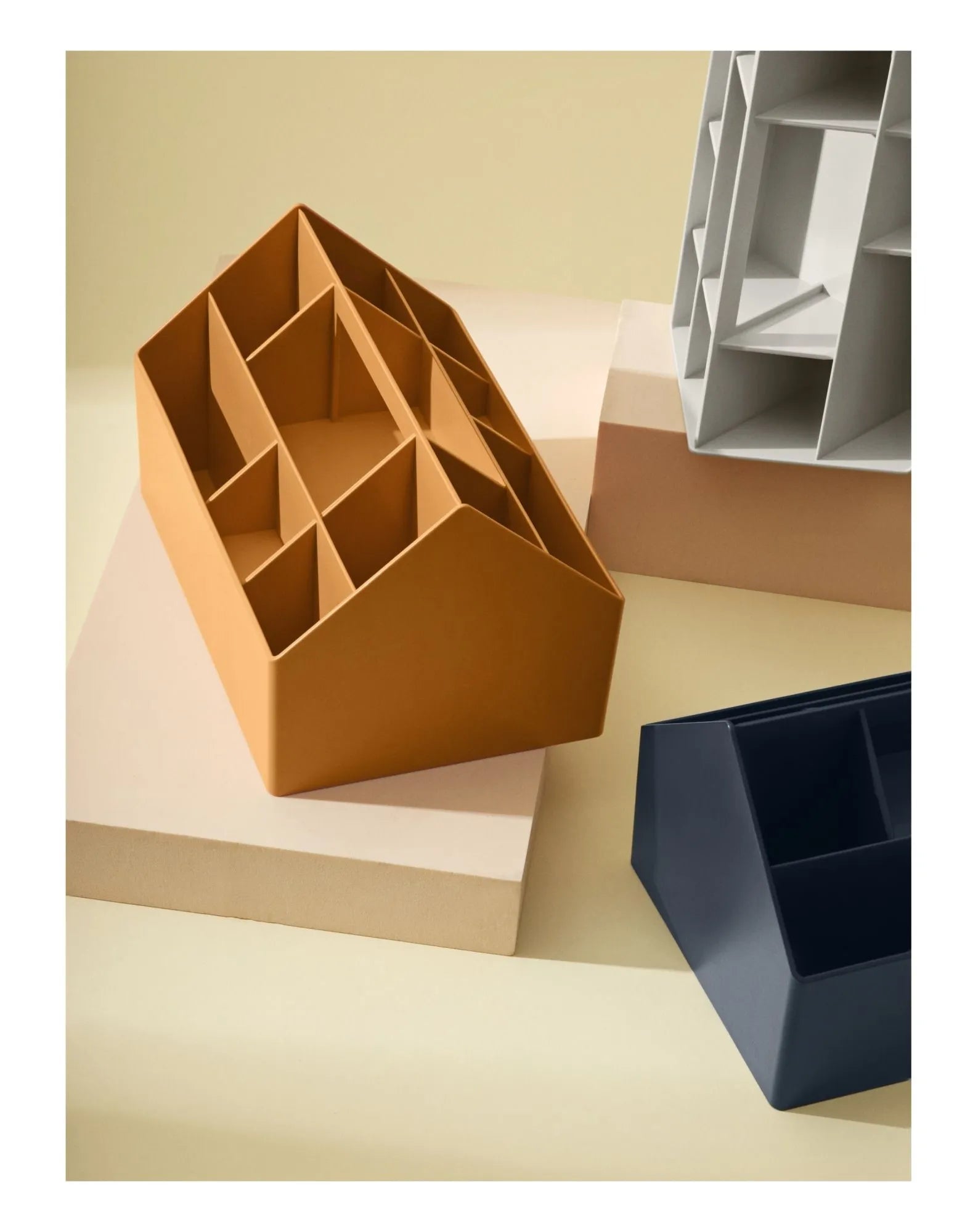 The simple and functional design of the Sketch storage box references the architectural lines of a house. Moulded in one monolithic piece with a handle for portability, it offers several small storage compartments. Made from recycled plastic, it is ideal for any office space, at home or in a mobile workplace.