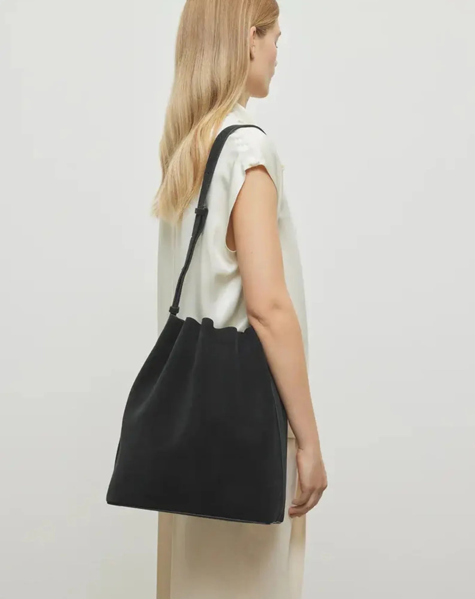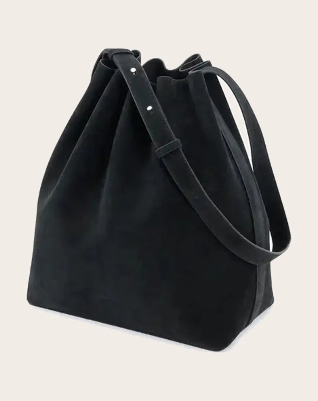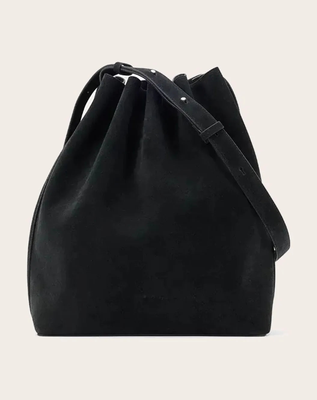 The Marin Supple Medium offers a softer interpretation of the bucket bag, characterized by its flowing lines and slightly rounded silhouette. A drawstring closure tightens the top of the bag into delicate pleats, adding a sense of movement to this minimalist design, while its adjustable shoulder strap allows it to be worn across the body or over the shoulder, easing the transition from day to evening. Crafted in Italian suede calf leather, the soft texture enhances the bag's natural curves. This material offers a more casual structure, while retaining enough hold to preserve shape.