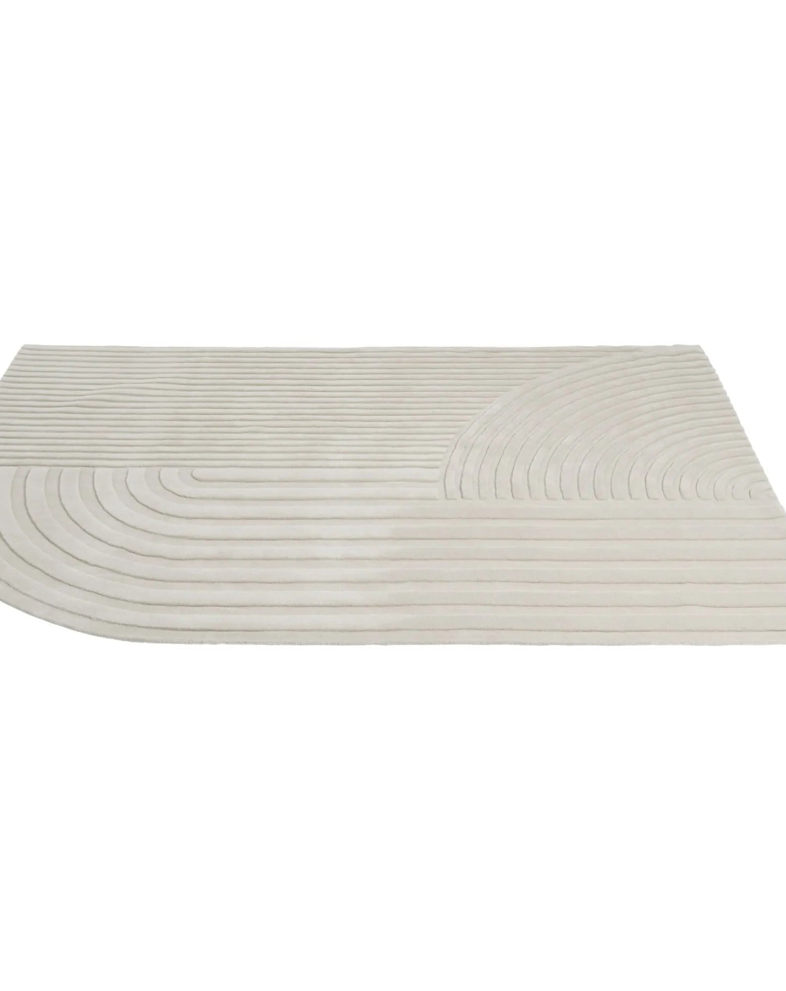 Relevo is a soft carpet with a distinct sculptural quality. Its striking graphic pattern is produced by cutting the tufted wool at different levels, creating an eye-catching shadow play that feels two-toned rather than monochromatic. This rug's unique rounded corner gives it a unique character, a dynamic expression in any setting.