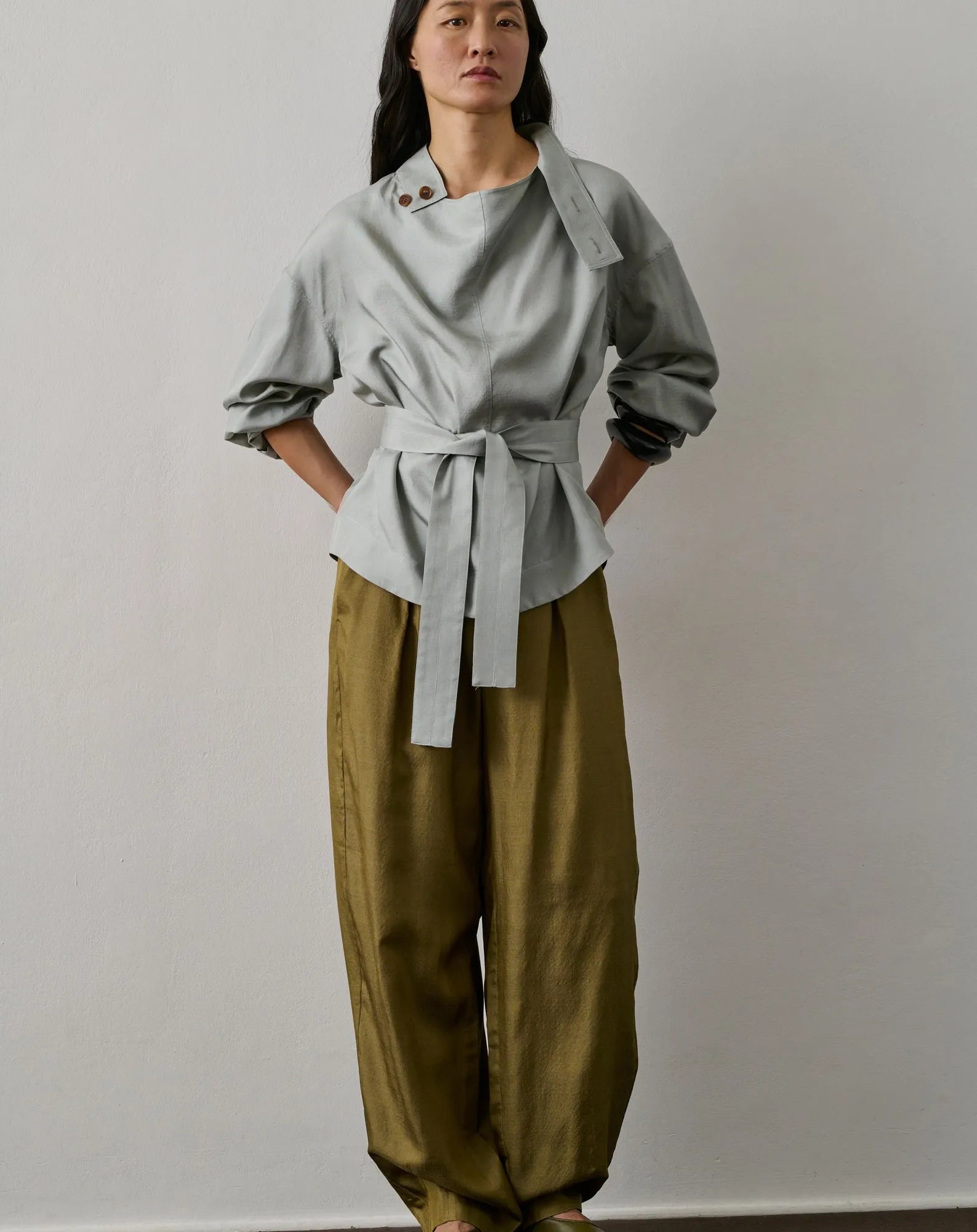 Silk shirt,Loose fit,Long sleeves,High button-down collar,Button-down collar,Removable belt included