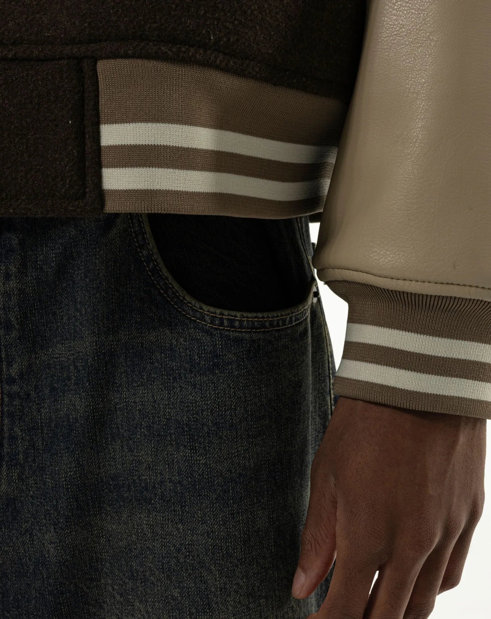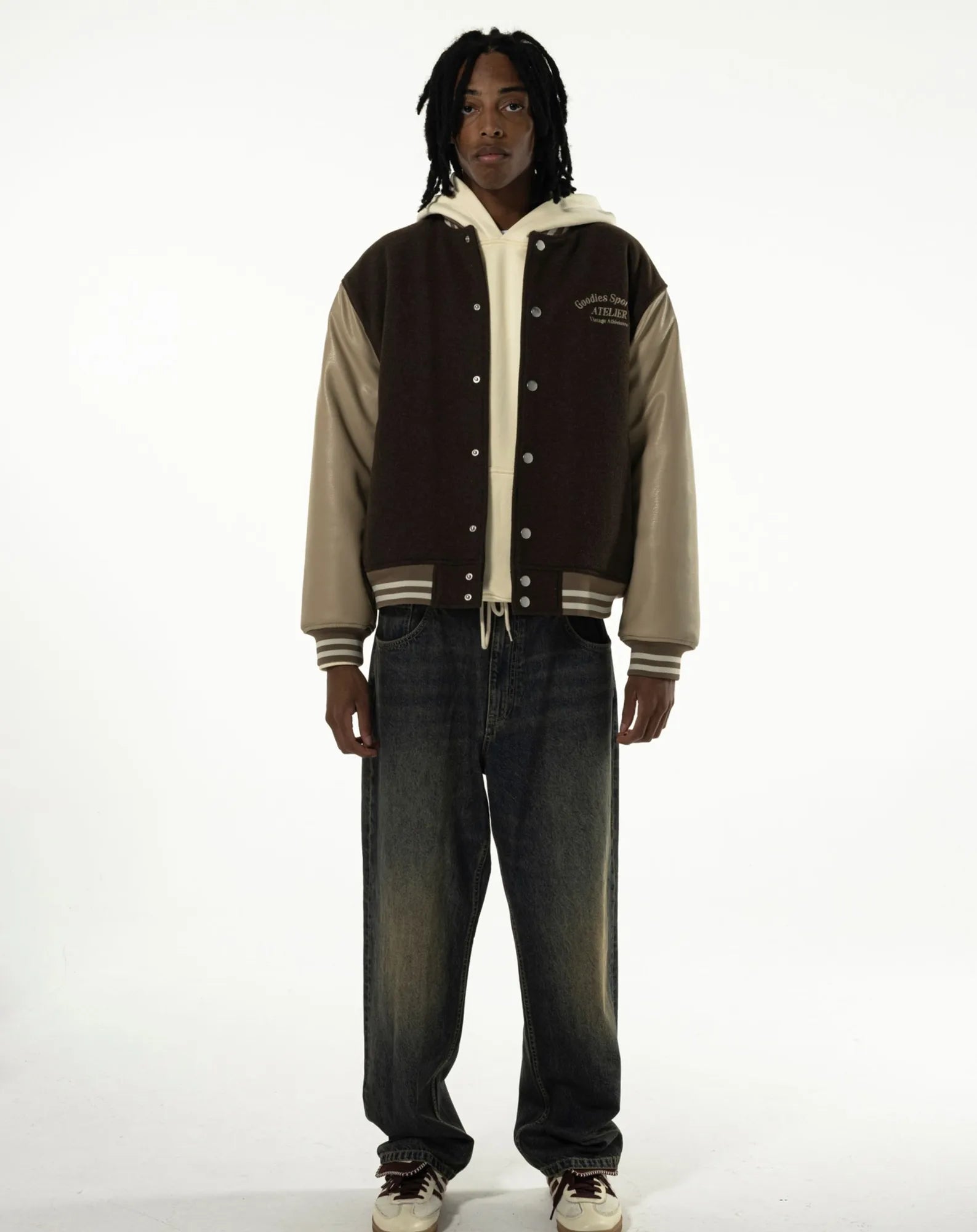 Brown varsity jacket with ecru detailing and ribbing. Front and back chenille patches with embroidered logo.
