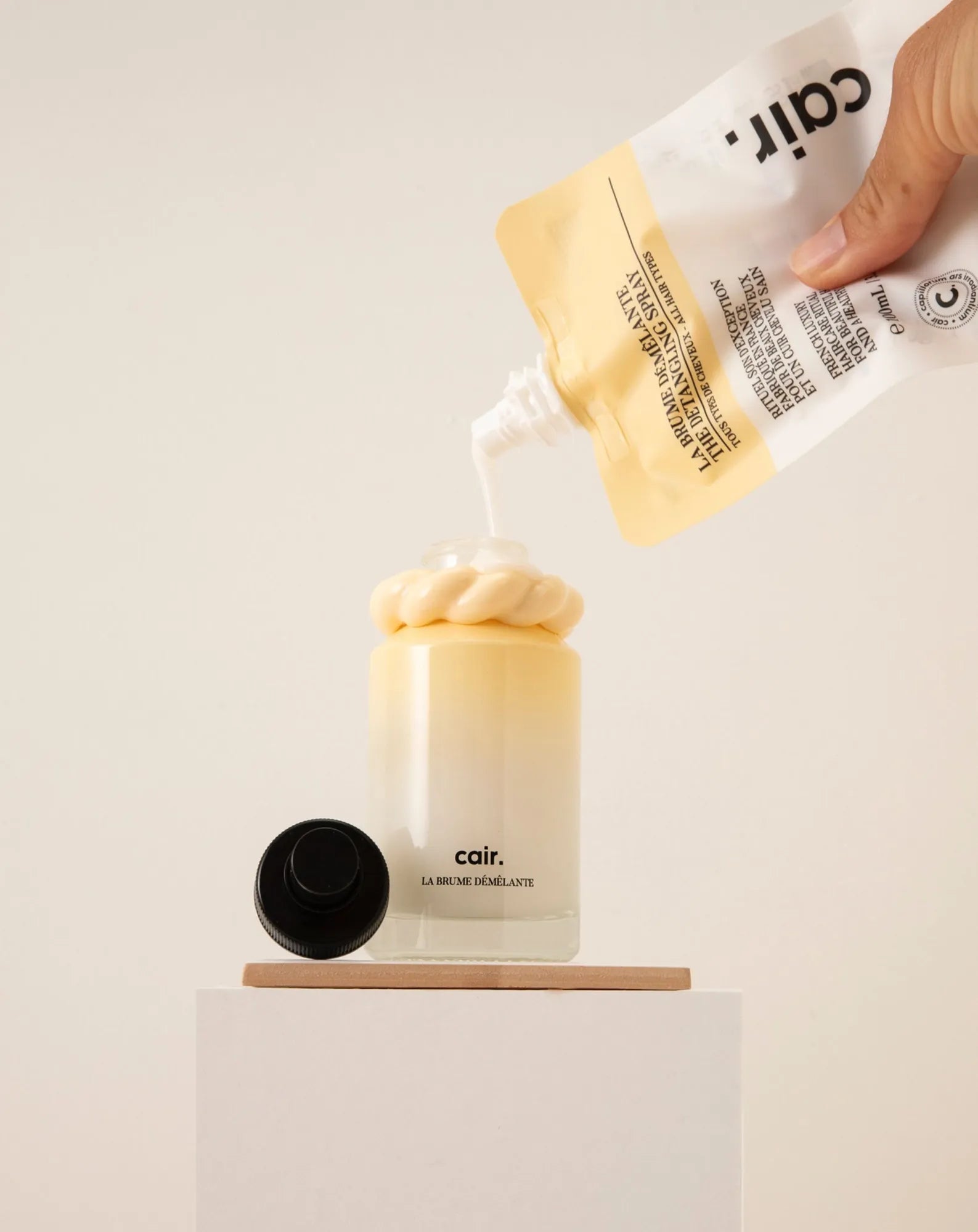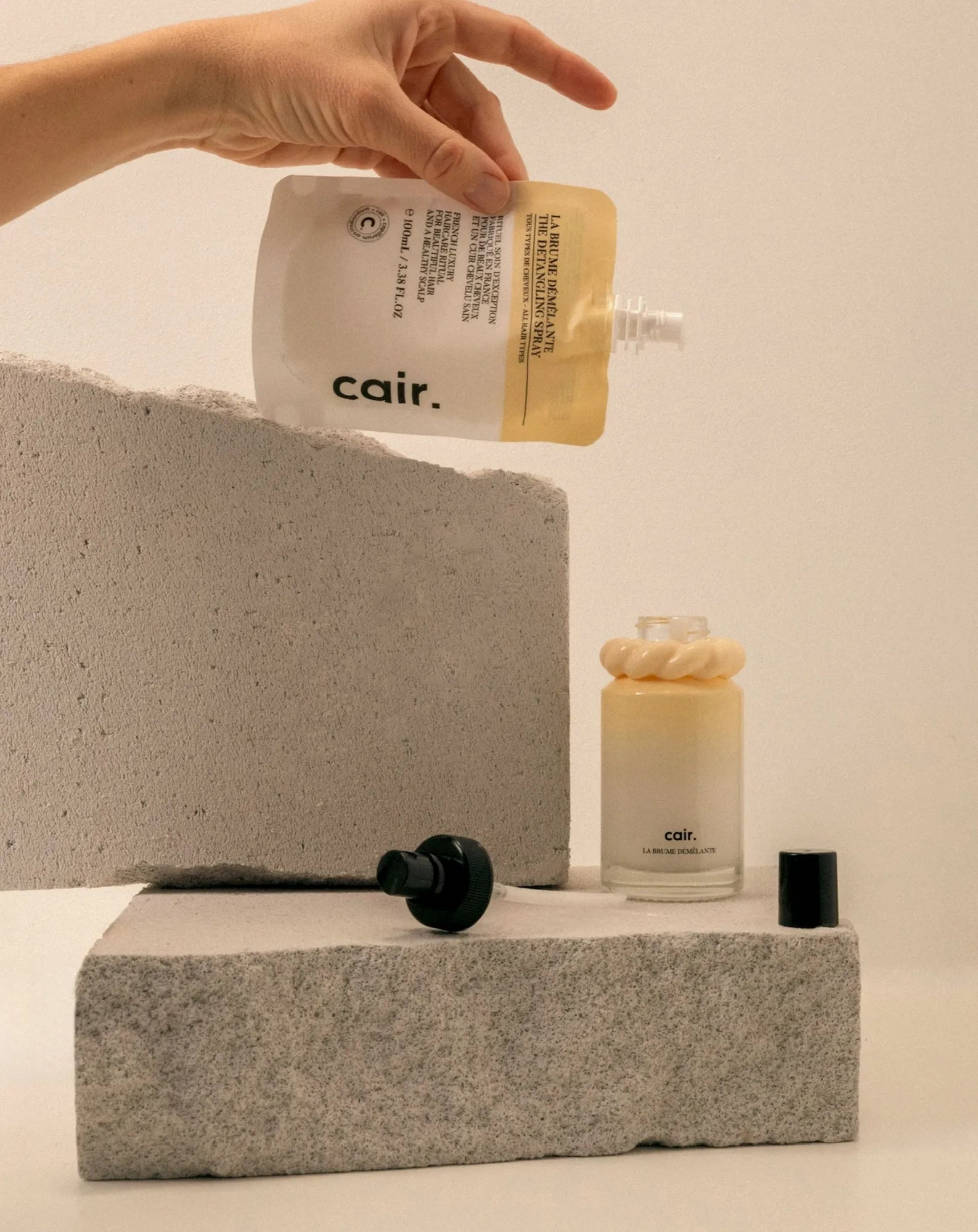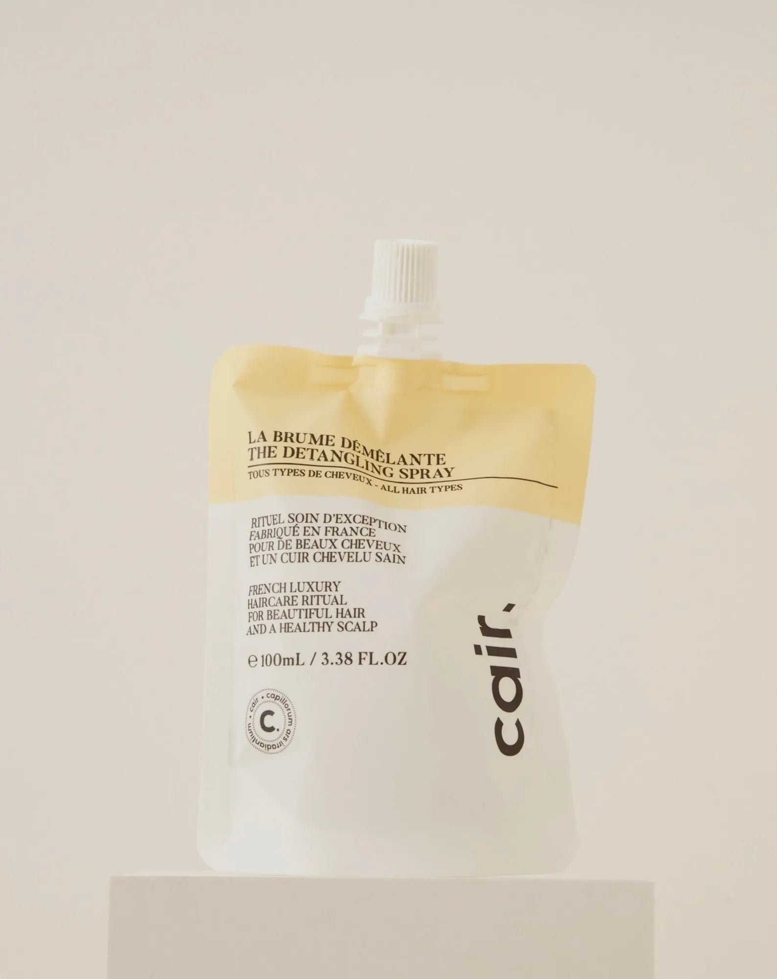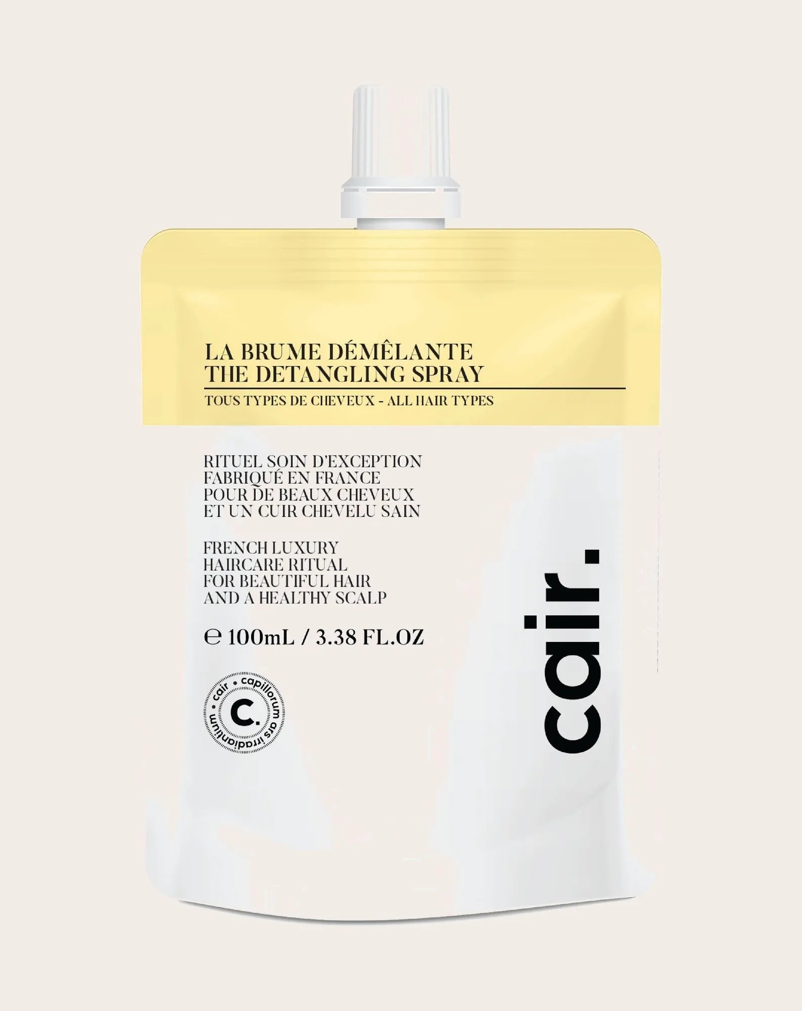 Ideal for getting rid of tangles, Cair detangling spray is a hair ritual essential. Don't forget to bring refills so you never run out! Designed in recyclable mono-material, the refill bottle is 100 ml, just like your detangling spray.