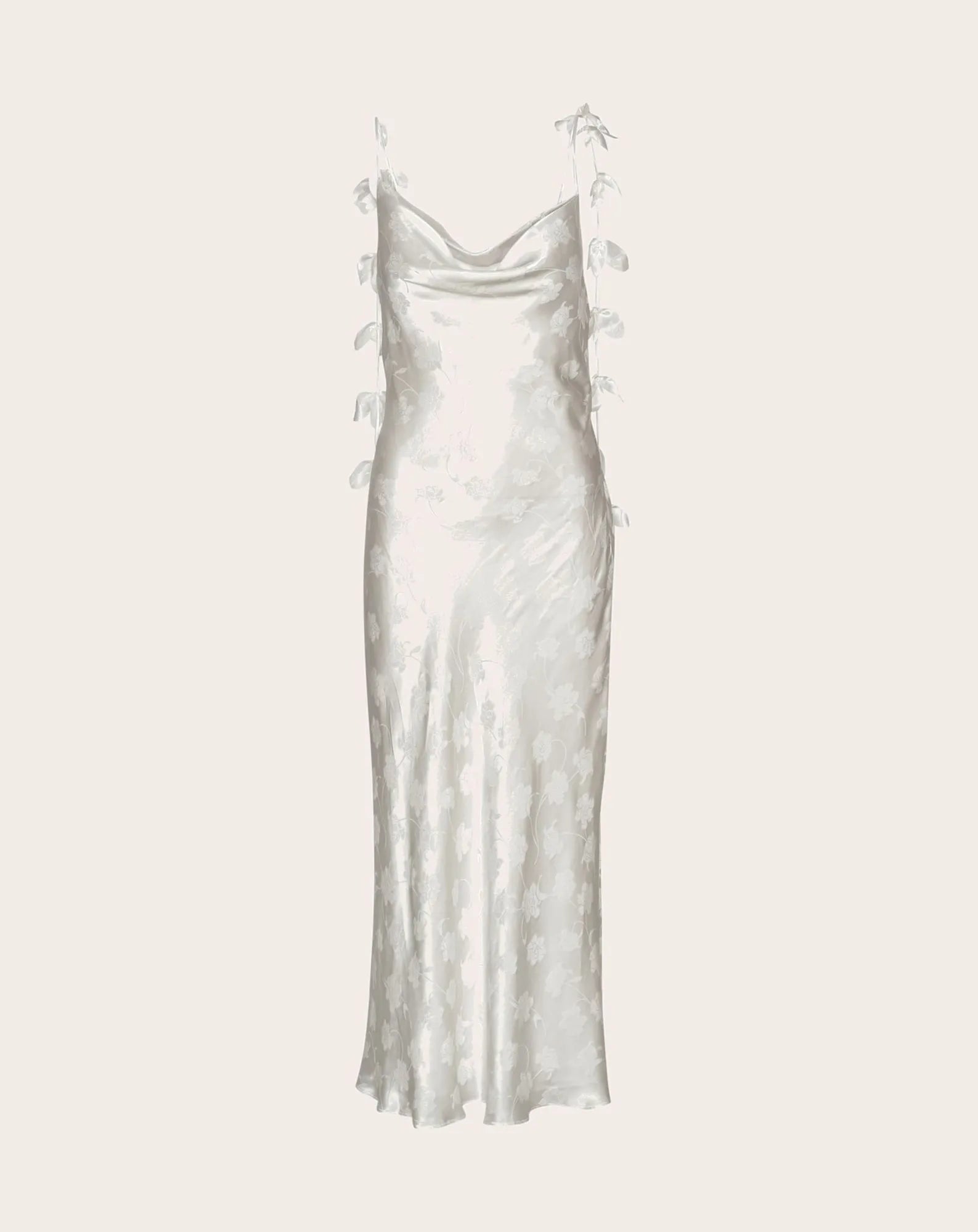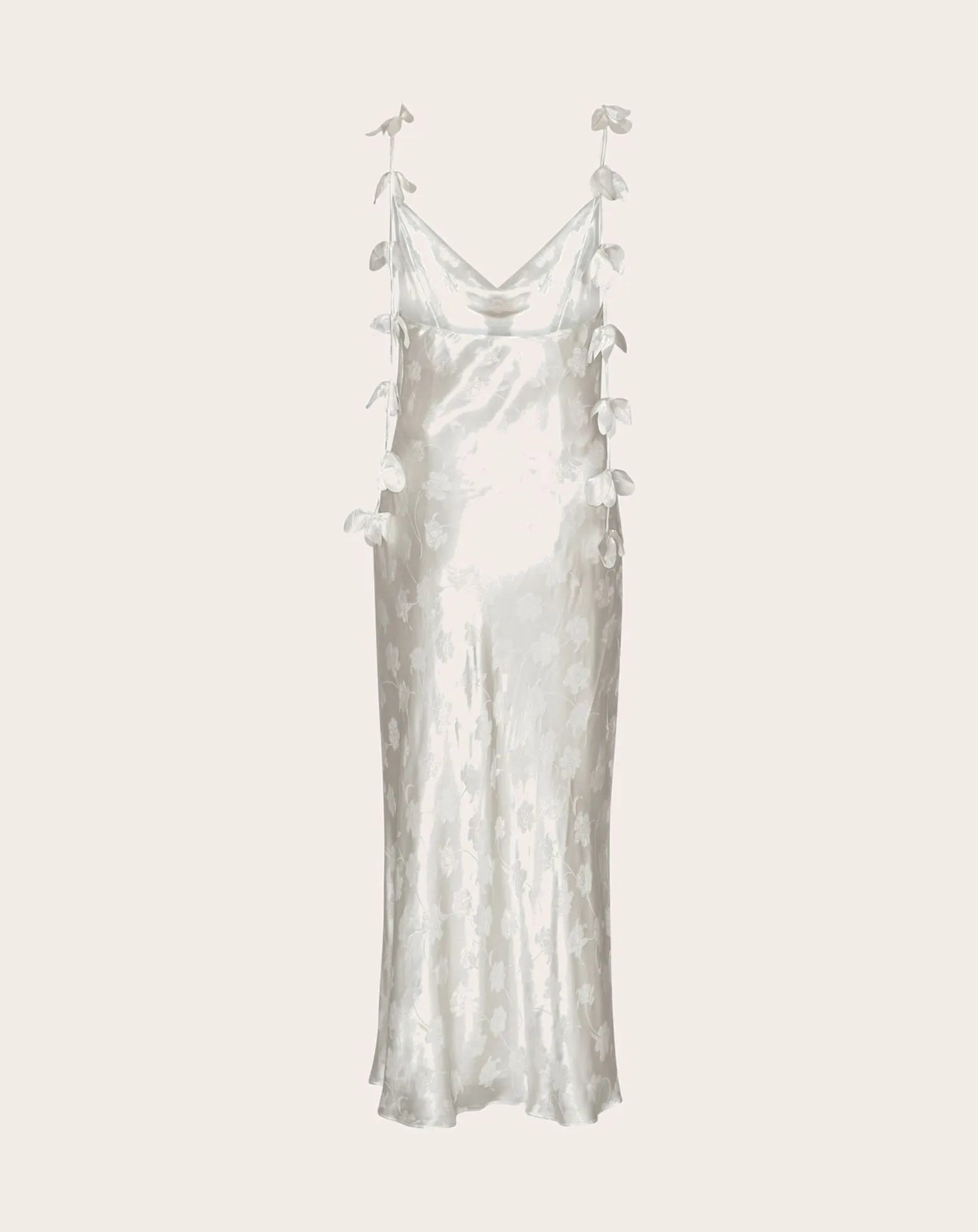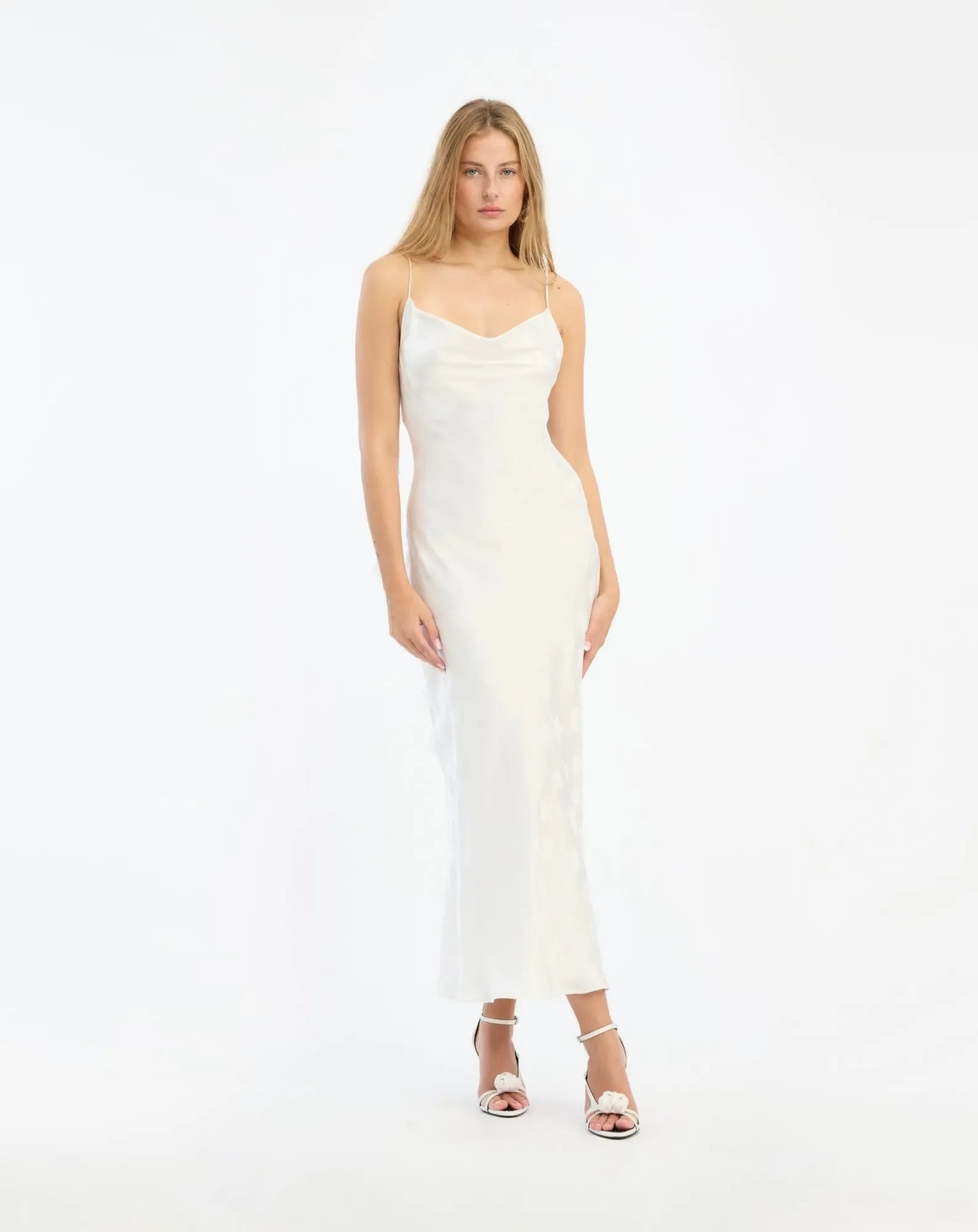 A midi-length slip dress crafted for a smooth, fluid drape. Its understated design enhances natural elegance and timeless sophistication.