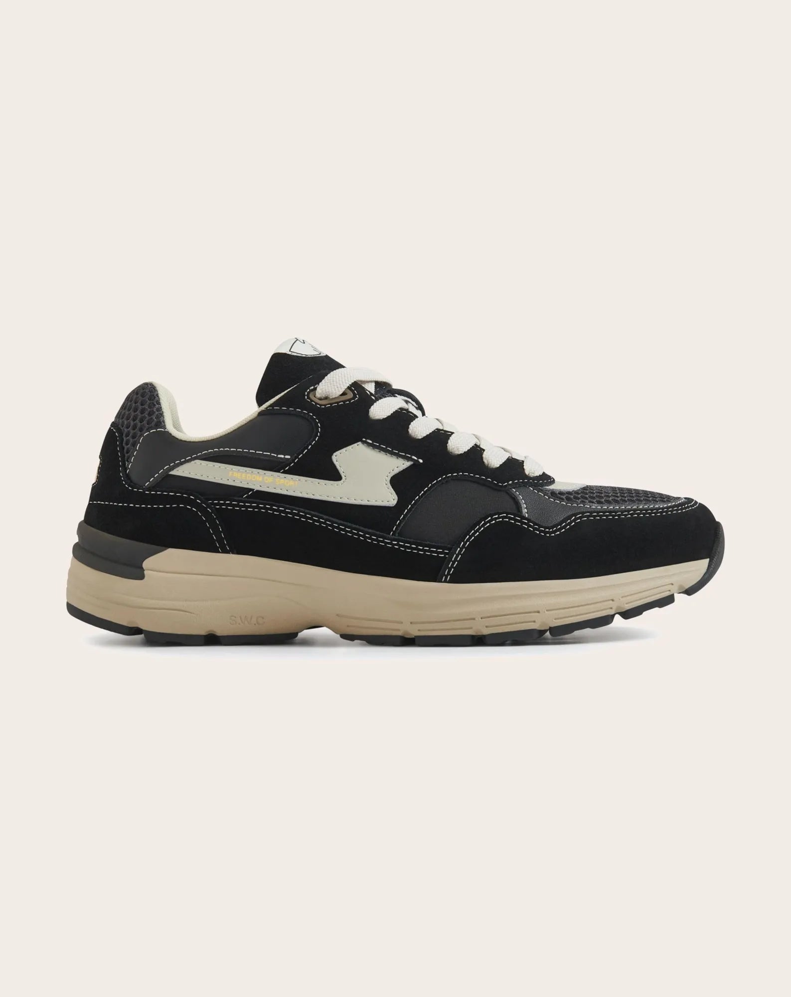 - La Amiel S-Strike est notre version d'une silhouette de course intemporelle des années 90. Elle est dotée d'une empeigne légère en daim woodland avec une partie avant en cordura woodland ton sur ton et un S-Strike en cuir noir. La semelle est composée d'une semelle technique légère en trois parties, avec une semelle intermédiaire en EVA à faible densité, une semelle inférieure à crampons et un support de talon en TPU S-Strike pour la stabilité. Cette construction permet d'obtenir une chaussure confortable et légère pour un usage quotidien.