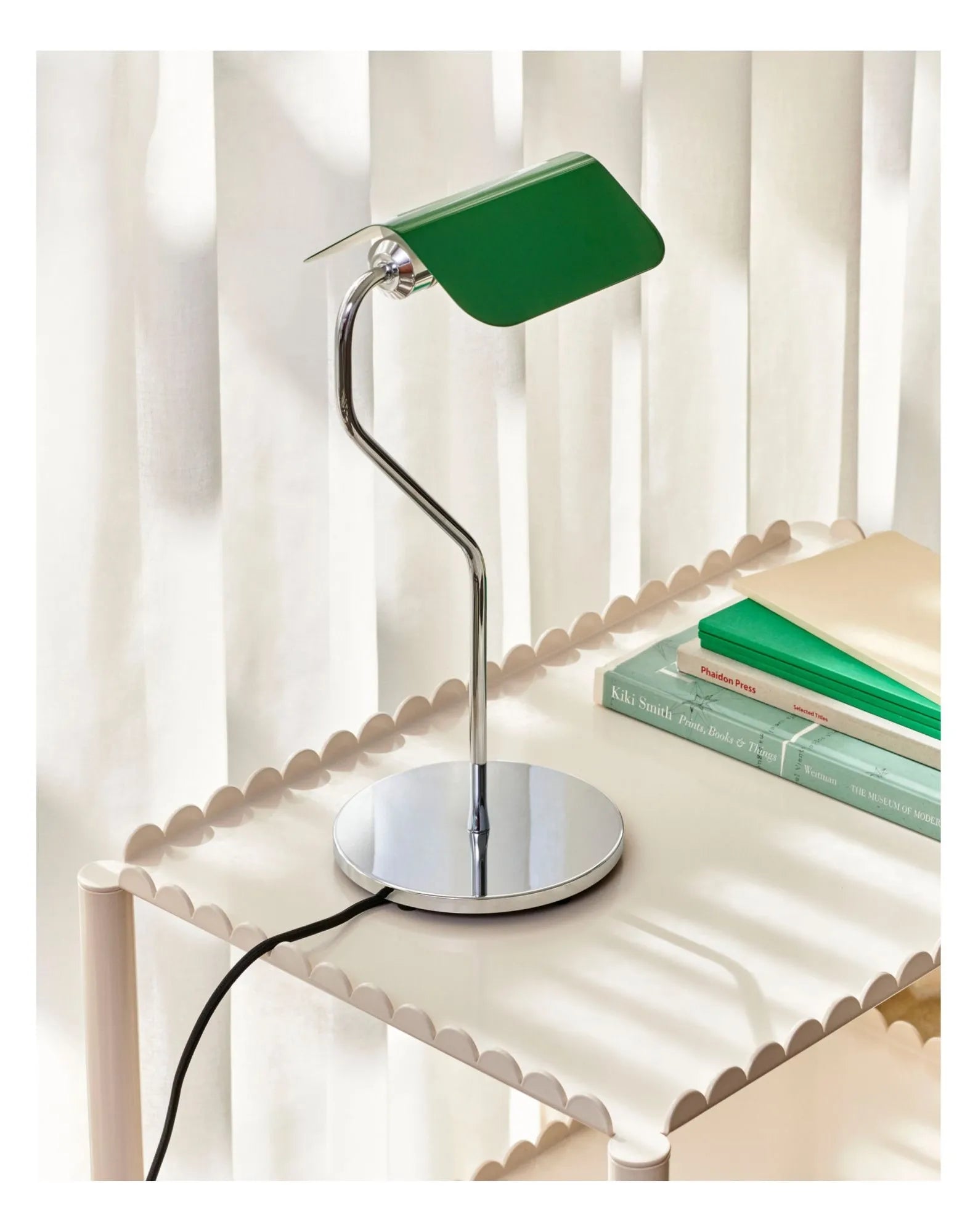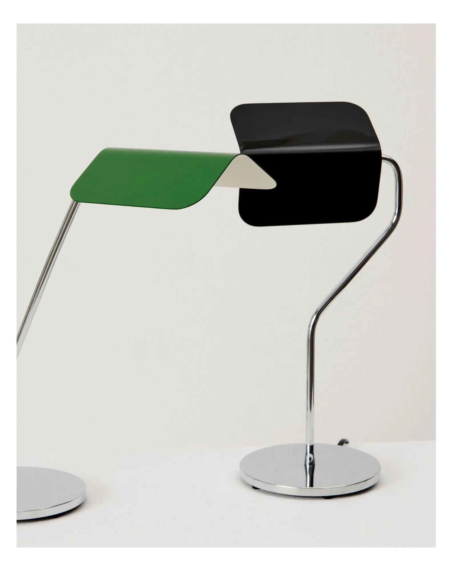 Cette série de lampes s'inspire de la fameuse Banker's Light. Le designer leur donne ici une touche contemporaine avec des abat-jour en forme de toits pointus et une base chromée minimaliste.