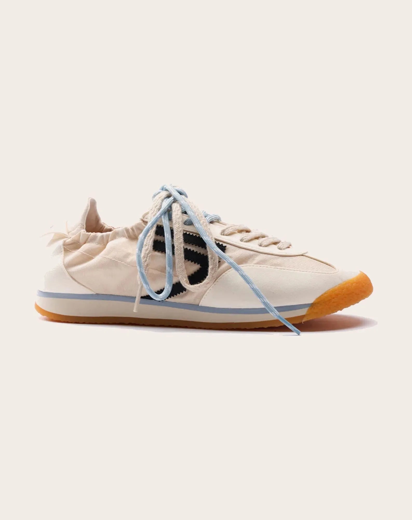 - Nylon et microsuède blanc cassé avec logo noir et détails blanc cassé. Semelle extérieure beige, bleu clair et miel et doubles lacets bleu clair et beige clair.