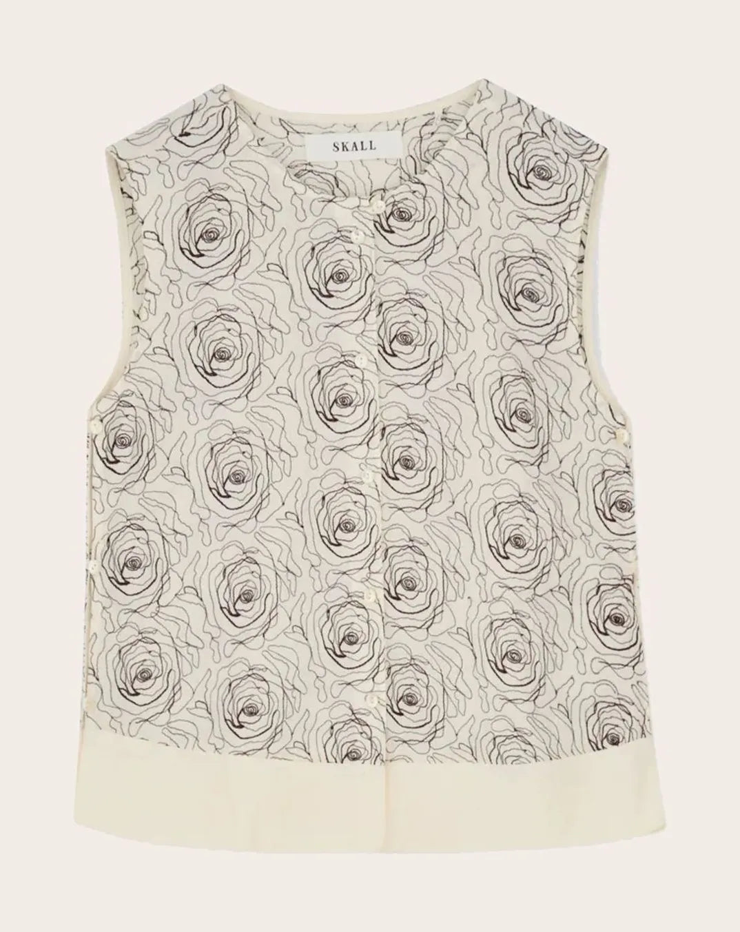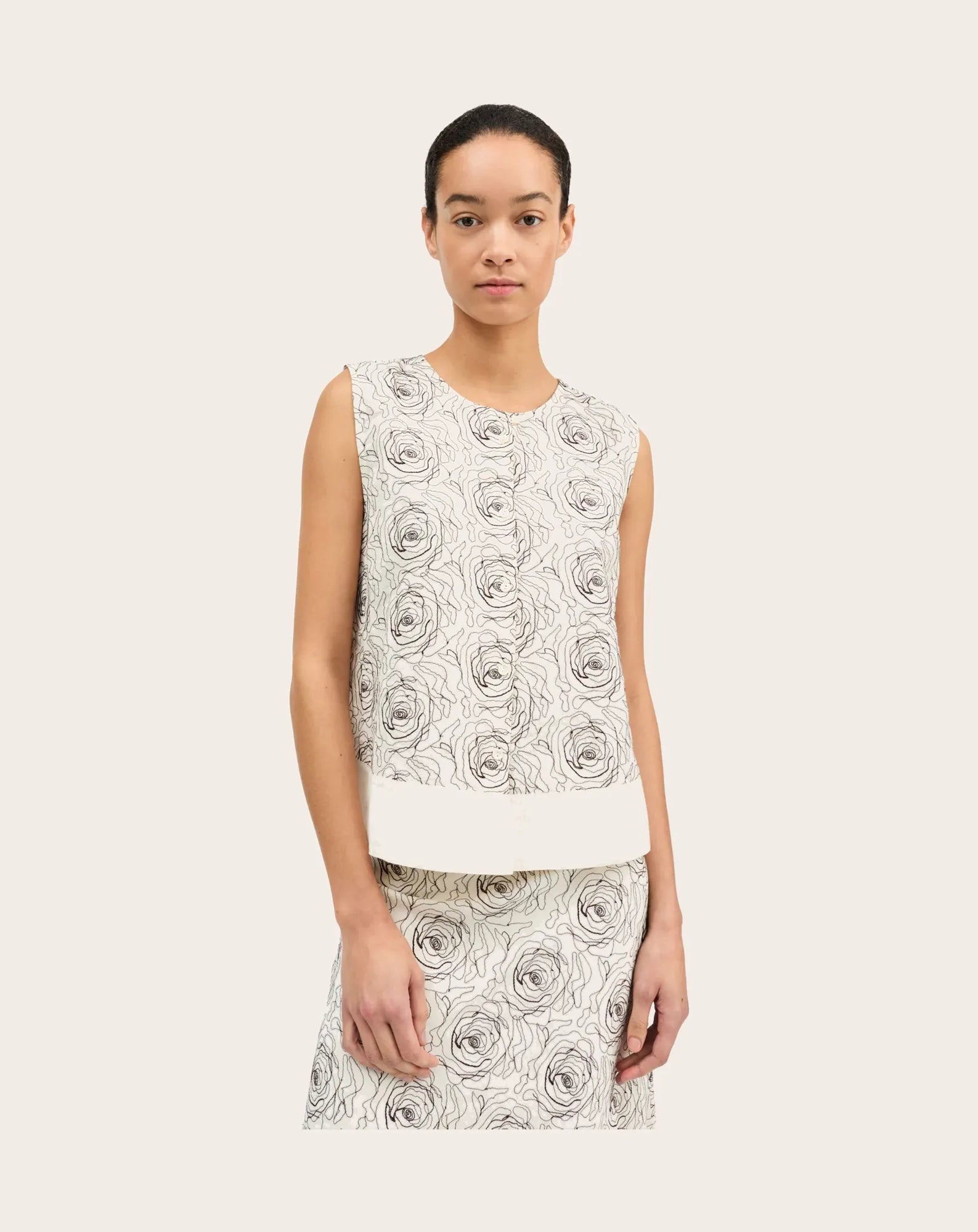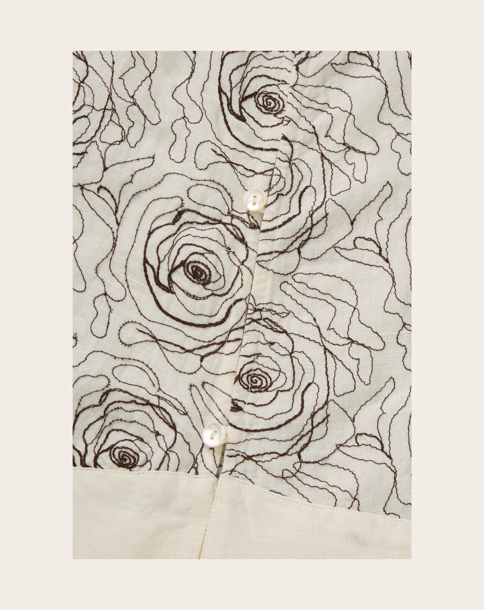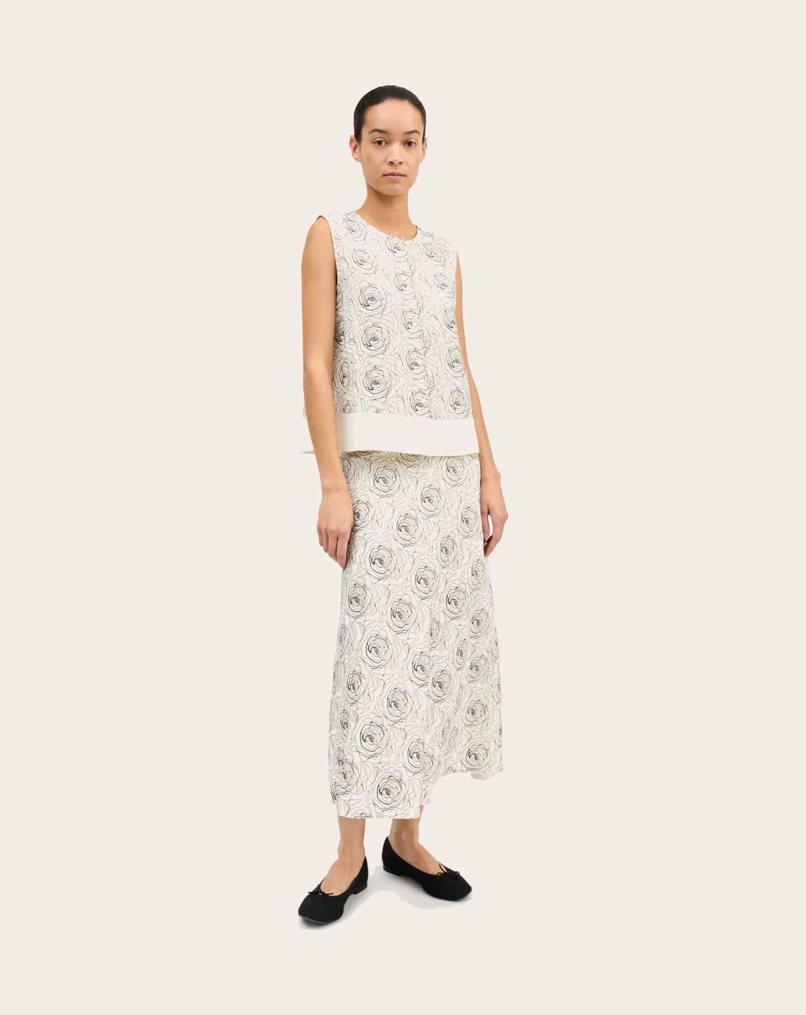 - Jupe longue coupée en biais, brodée de roses sur toute sa surface.