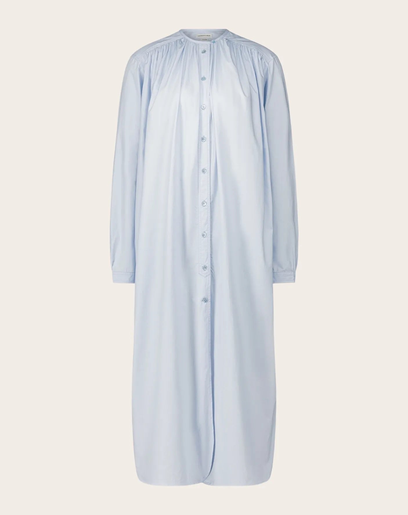 - - Robe mi- longue en popeline de coton uni - Volume ample froncé - Manches longues - Col rond boutonné